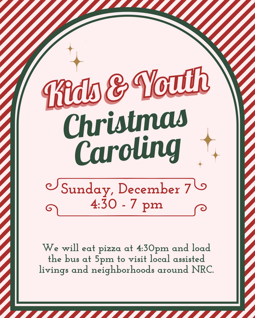 The Kids and Youth are going Christmas Caroling again this year! If you're in K-12th grade, we will meet in the Outback at 4:30pm for pizza, and then load the bus at 5pm to go caroling in neighborhoods around NRC.