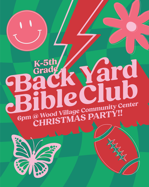 Our Kids' ministry (K-5th Grade) will meet at Wood Village on December 17 for our next Backyard Bible Club. We will have a special Christmas Party!! The night will include a Bible lesson, craft, and games! If you would like to serve, contact Sara.